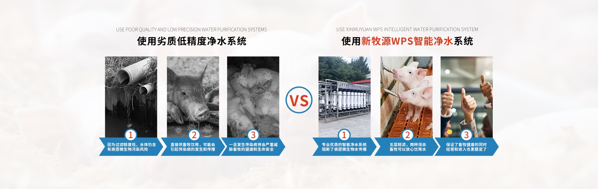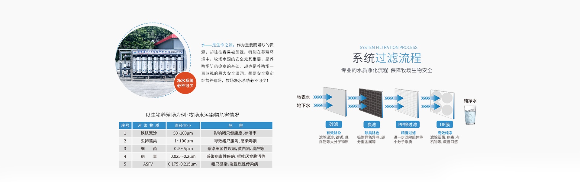 新牧源與法國蘇伊士水務集團聯合開發的WPS牧場智能凈水系統,采用全球最頂尖的超濾膜技術,可以分離水中全部的雜質及病原微生物。該系統能最大幅度的提高牧場飲水的安全等級,對防控非瘟起到了至關重要的作用。