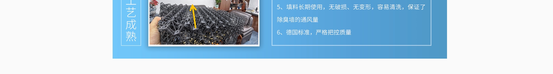 上面經過噴淋,像氨氣這些水溶性很強的有害氣體就會溶于水中從而避免被直接排到外界。同時塑料濕簾的特殊材質還能有效過濾各種雜質。