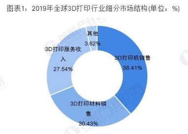 3D打印不僅可以一次單獨制造產品,而且還可以創建大量定制產品,這既可以節省大量的時間,減少浪費,還可以節約成本。以這種方式創建的產品也將更輕,但功能同樣強大,絲毫不遜于傳統方法創造的功能強度。根據市場研究機構IDC預計,2019年全球3D打印的市場規模將達到138億美元,比2018年擴大21.2%。其中,53億美元來自打印機銷售,42億美元來自打印材料銷售,38億美元來自打印服務。3D打印材料的占比達到30.43%。
